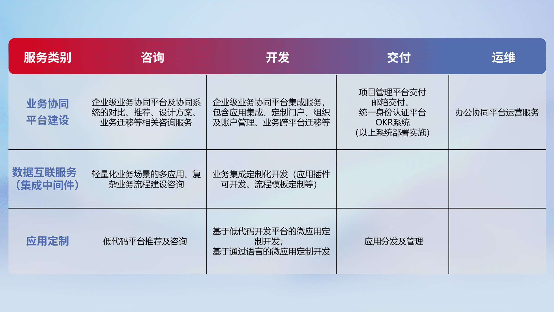 针对钉钉、、、企微、、、IDaas等平台级产品提供产品的规划、、、、方案、、、交付、、、、定制化开发等服务,,实现如统一协同办公、、智能客户服务、、混合会议管理、、、智能数据查询、、、、等业务场景,,,,实现数字化转型。。