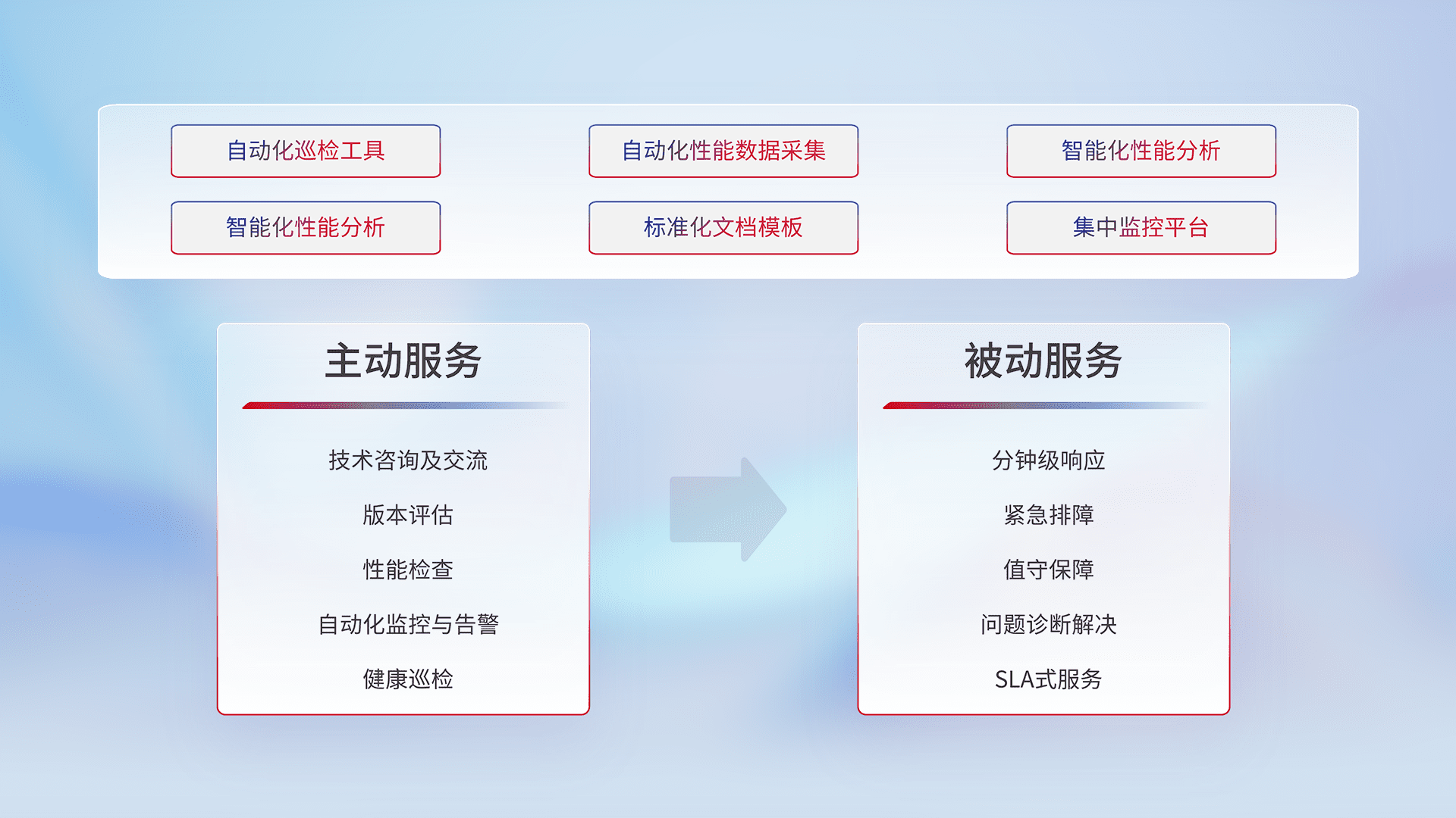 智能化工具和标准化文档,,,保障服务质量,,提供主动服务(包含技术咨询、、、版本评估、、、性能检查、、、自动化监控与告警、、、健康巡检)和被动服务包含(分钟级响应、、、、紧急排障、、值守保障、、、、问题诊断解决、、、SLA服务)。。